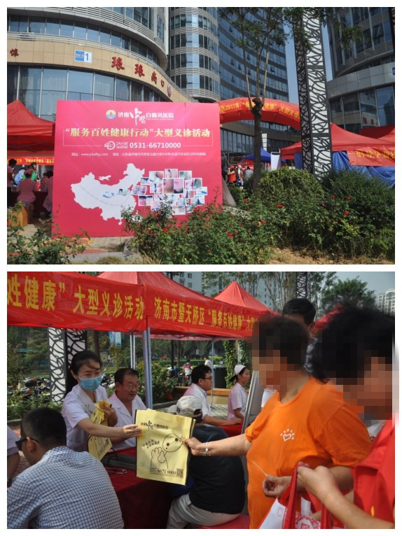 今日,由国家中医药管理局办公室、中央军委后勤保障部卫生局;省、市卫生计生委牵头的2017年“服务百姓健康行动”,在济南明湖广场开启首场义诊活动。包括济南中医白癜风医院在内的近三十家医疗单位受邀参加本次活动,为济南市民普及相关卫生知识,筛查居民常见疾病,给予免费的诊疗服务支持。